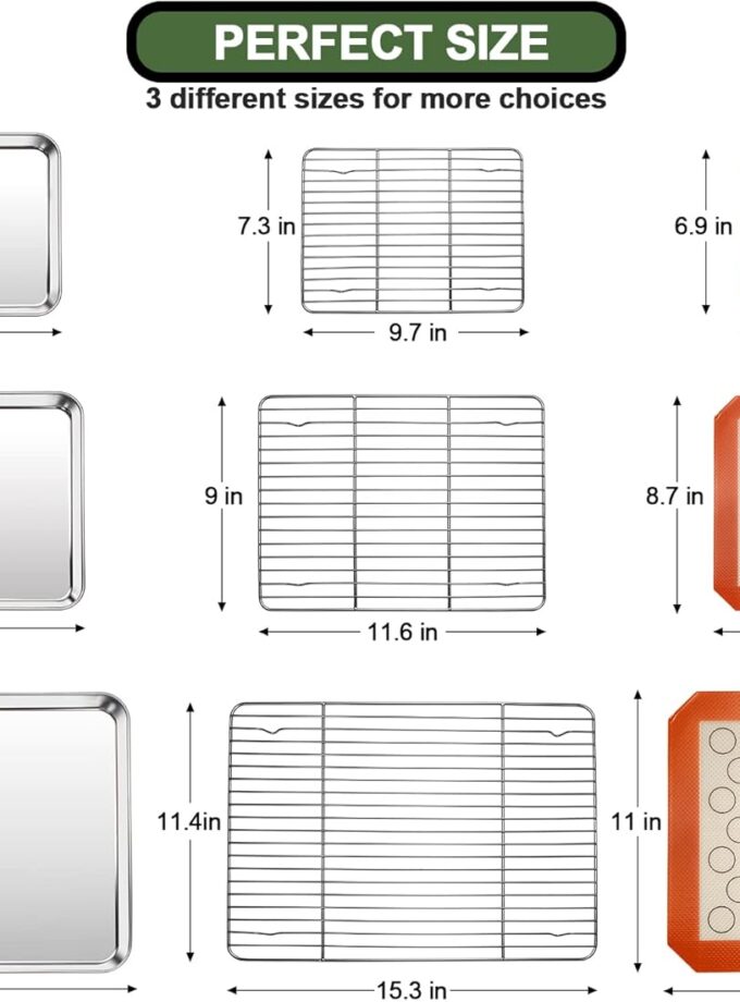 - PREMIUM MATERIAL: The baking sheets and racks are made of high quality stainless steel 18/0 material without chemical coating or any other materials, you needn’t worry of rusty or chrome flaking off into your food